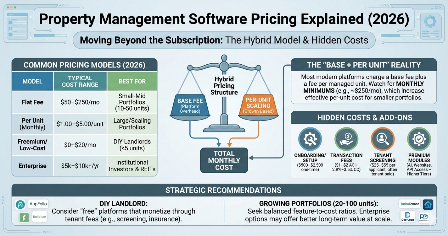 - Property management software pricing uses four models: per-unit per-month ($1-$5/unit), base platform fee ($49-$299/month), feature-to-price mapping with tiered access, and hybrid combinations
